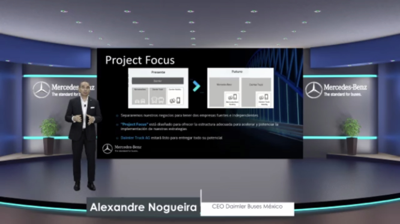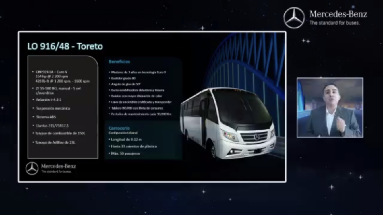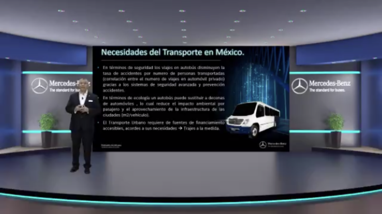 Durante la presentación virtual, Aldo Sauceda, gerente de Administración de Ventas y Planeación de Productos, comentó que 5 de cada diez vehículos de transporte urbano son Mercedes-Benz.