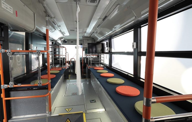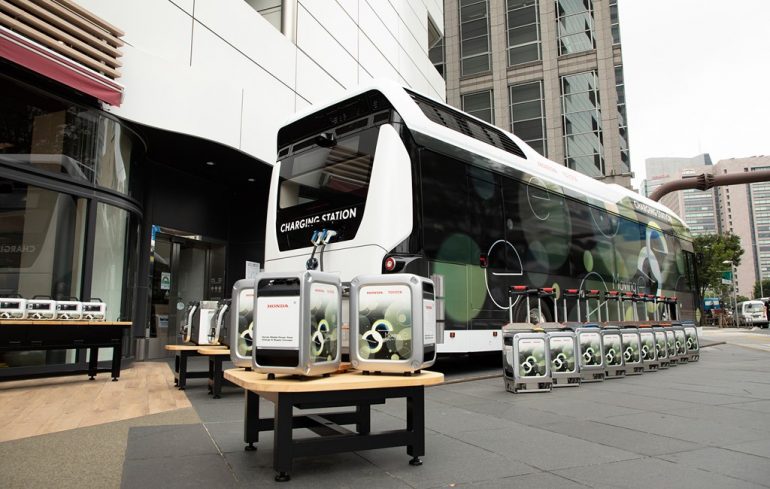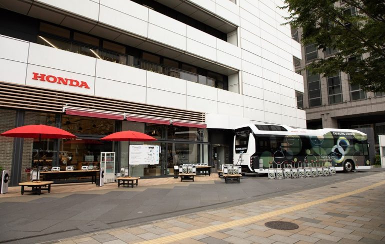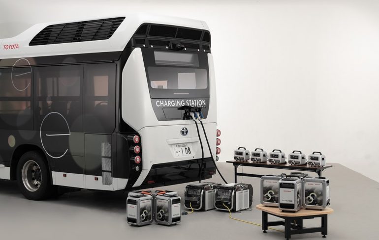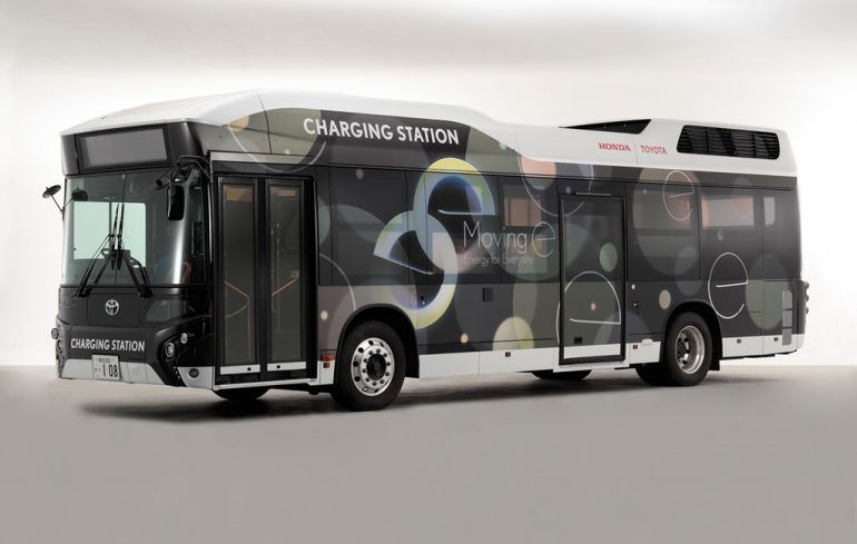 Toyota y Honda pondrá prueba este septiembre Moving e, un autobús que es impulsado por hidrógeno y que es capaz de generar electricidad y abastecer casas, coches eléctricos y otros dispositivos de energía en caso de un desastre natural o alguna emergencia.
