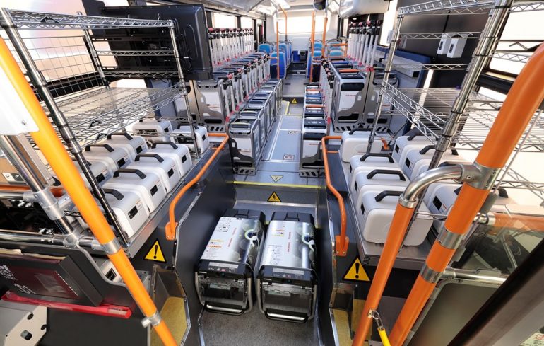 La capacidad máxima de energía de este generador es de 490 kilovatios hora (kWh), aunque si el autobús debe desplazarse unos 200 kilómetros para repostar hidrógeno, esta capacidad se reduce a los 240 kWh.